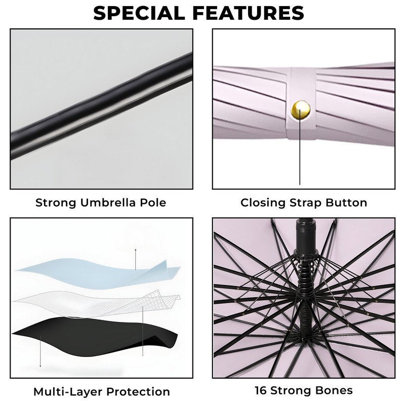 • HIGH-QUALITY MATERIAL – Made from high-quality materials, this 16 bone umbrella is designed to last. The automatic opening mechanism ensures durability and reliability in any weather. The umbrella’s construction is robust, providing excellent protection against wind and rain, making it a dependable choice for all.