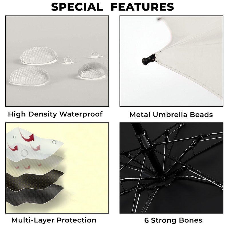• HIGH-QUALITY MATERIAL – Made from high-quality materials, this 6 bone umbrella is designed to last. The automatic opening mechanism ensures durability and reliability in any weather. The umbrella’s construction is robust, providing excellent protection against wind and rain, making it a dependable choice for all.